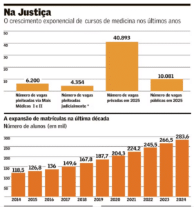 Segundo o estudo Demografia Médica no Brasil, da Associação Médica Brasileira (AMB), Faculdade de Medicina da Universidade de São Paulo (FMUSP) e Ministério da Saúde, neste ano, há quase 51 mil vagas de medicina, sendo 80% de faculdades privadas. Há cinco anos, período em que a judicialização não era tão forte, esse número era de 38,8 mil. A judicialização não era tão forte, esse número era de 38,8 mil. A judicialização começou a partir de 2018, quando o então governo Temer impôs uma moratória, proibindo a abertura de cursos de medicina por cinco anos.