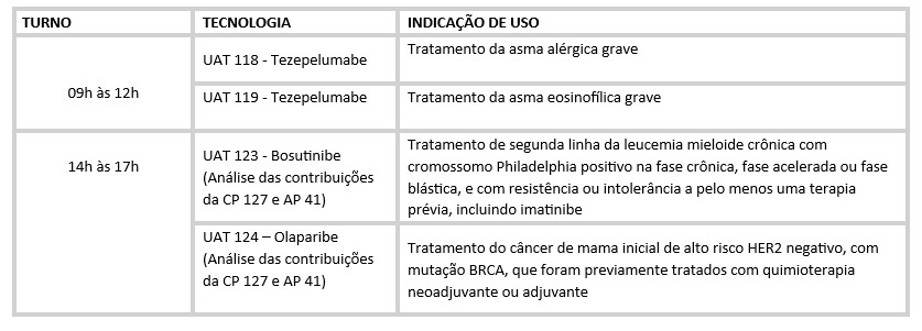 Nos dois dias serão discutidas cinco propostas de inclusão de tecnologias no Rol de Procedimentos e Eventos em Saúde, lista que constitui as coberturas obrigatórias para os beneficiários de planos de saúde. Das cinco tecnologias em pauta, duas delas já passaram pela etapa de participação social ampliada e a Comissão irá analisar as contribuições da sociedade realizadas por meio da Consulta Pública 127 e Audiência Pública 41.